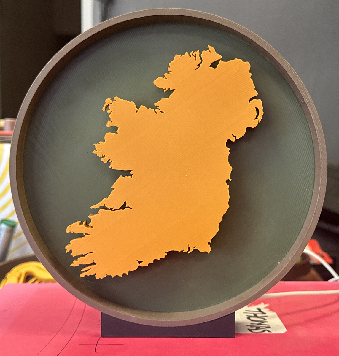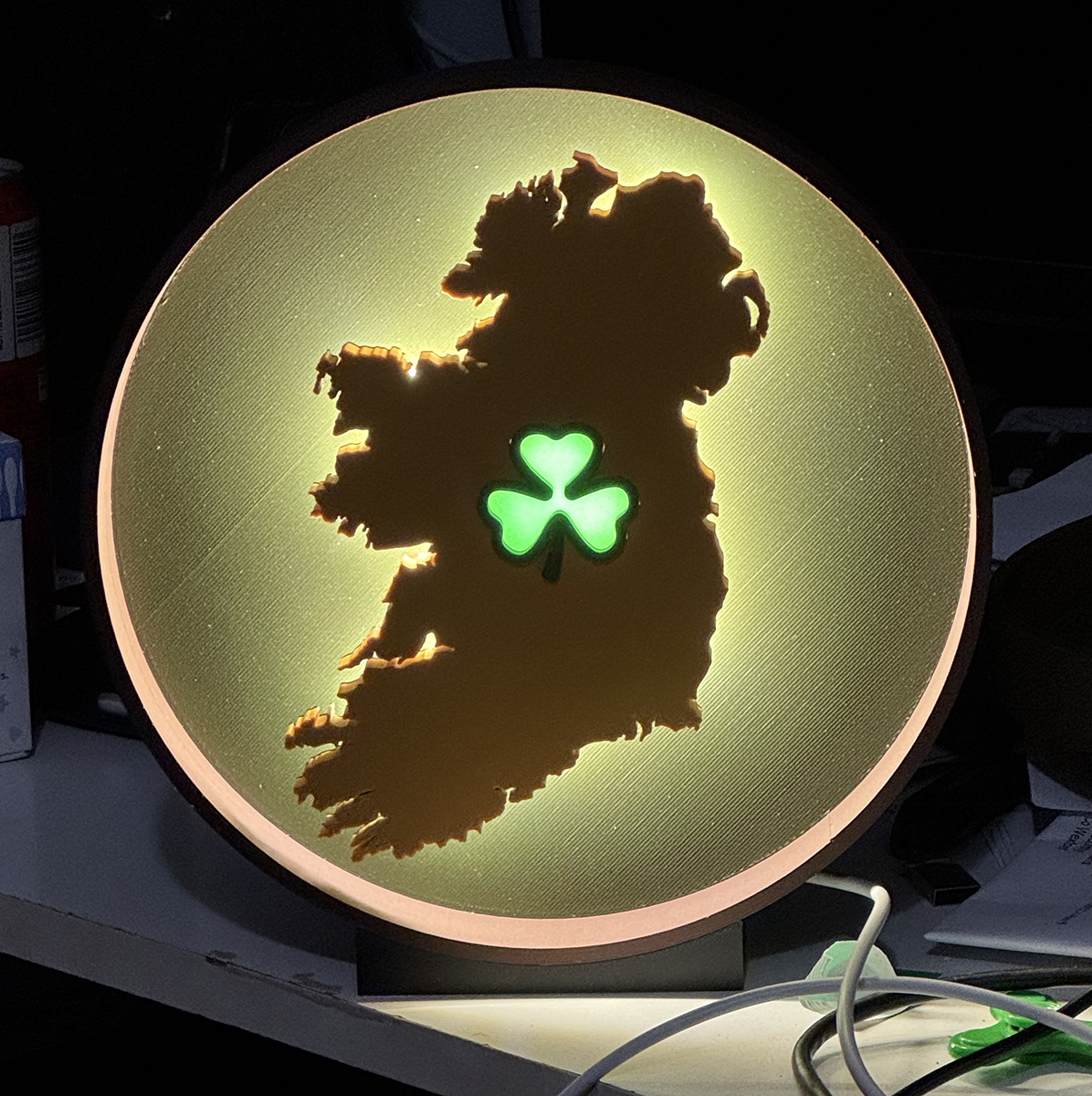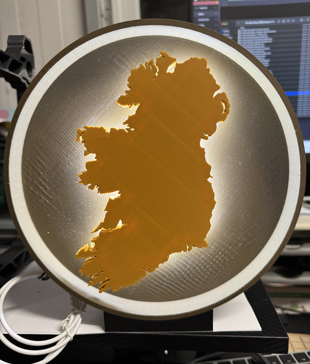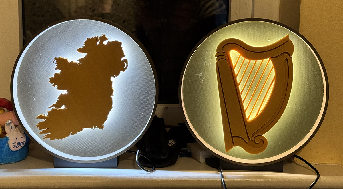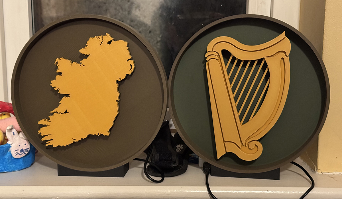 The rear frame of the Ireland series is printed in Wood Effect PLA. The center icons are printed in a mixture of wood effect and standard PLA, offering a wider choice of colours than the wood effect alone. Lamps can be customised with your family name if desired.